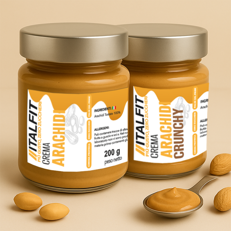Creme 100% di ARACHIDI senza zuccheri aggiunti, senza olio di palma, senza glutine e ad alto contenuto di proteine Naturali.